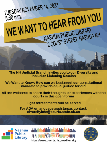 NASHUA – As part of its ongoing Diversity and Inclusion Strategic Plan, the New Hampshire Judicial Branch will be hosting a Listening Session at the Nashua Public Library on Nov. 14 at 5:30 p.m. The event will take place in the large meeting room on the library’s lower level. The Listening ...