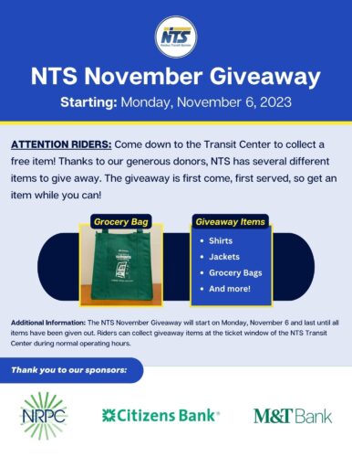 Come on down to the Transit Center to collect a free item. Thanks to our generous donors, NTS has several giveaway items including shirts, ...