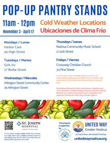 NASHUA – Beginning the week of Nov. 3, the Pop-Up Pantries organized by the United Way of Greater Nashua will move to their indoor winter locations.