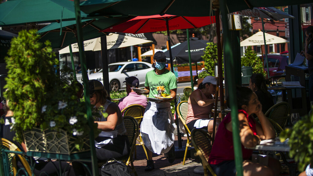 A waiter in a face mask delivers food to the tables outside of a local restaurant during lunch on Friday, Sept. 4, 2020, in Hoboken, N.J. (AP Photo/Eduardo Munoz Alvarez)