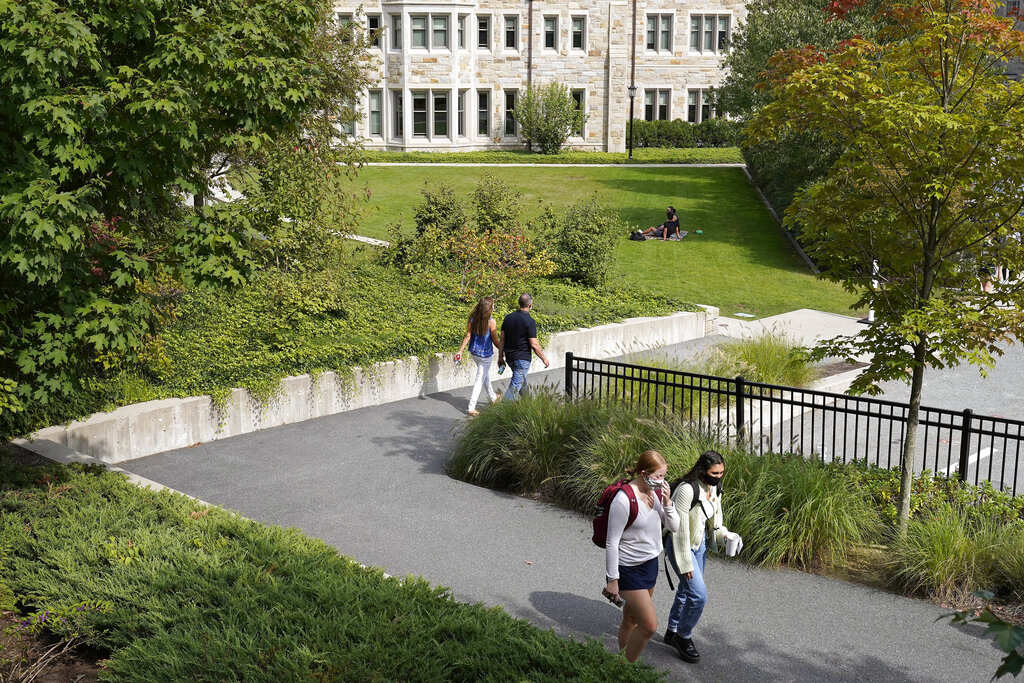 College students wear masks our of concern for the coronavirus on the Boston College campus, Thursday, Sept. 17, 2020, in Boston. (AP Photo/Steven Senne)