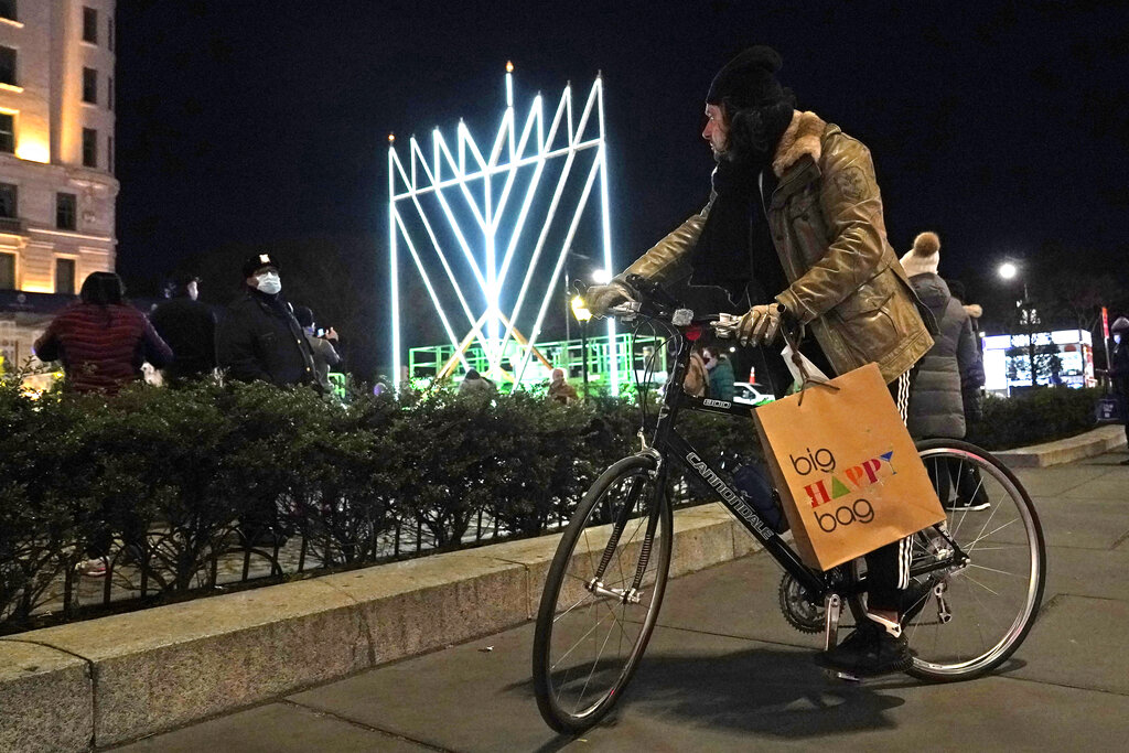 A man on a bicycle pauses on the sidewalk along Fifth Avenue in Manhattan near what has been described as "the world's largest Hanukkah menorah," Thursday, Dec. 10, 2020, in New York, on the first night of Hanukkah, the annual eight-day Jewish festival of lights. Due to coronavirus restrictions, a limited and socially-distanced crowd was allowed to attend. (AP Photo/Kathy Willens)