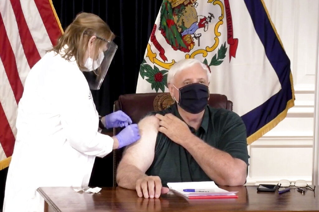 In this image made from video released by the State of West Virginia, a nurse administers a coronavirus shot to west Virginia Gov. Jim Justice, Monday, Dec. 14, 2020, in Charleston, W.Va. The 69-year-old Republican governor said he would receive a shot before cameras which would make him one of the first top elected officials in the country to get vaccinated. Officials said they want to demonstrate their confidence in the vaccine. (State of West Virginia via AP)