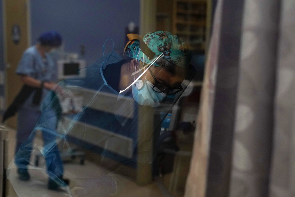 Registered nurse Kyanna Barboza tends to her COVID-19 patient at St. Joseph Hospital in Orange, Calif., Thursday, Jan. 7, 2021. The virus is surging in virtually every state. California is particularly hard hit, with skyrocketing deaths and infections threatening to force hospitals to ration care. (AP Photo/Jae C. Hong)