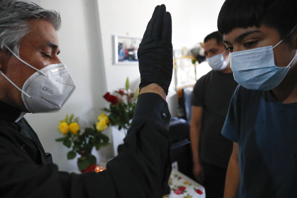 FILE - In this Sunday, May 10, 2020 file photo, the Rev. Fabian Fabian Arias offers a blessing over the head of a family member after leading an in-home funeral service for Graciela Ruiz Martinez who died of COVID-19, in the Queens borough of New York. For the first time during the pandemic, Arias performed funeral services in private homes — donning a surgical mask and gloves to join the mourning families, starting that weekend. (AP Photo/John Minchillo)