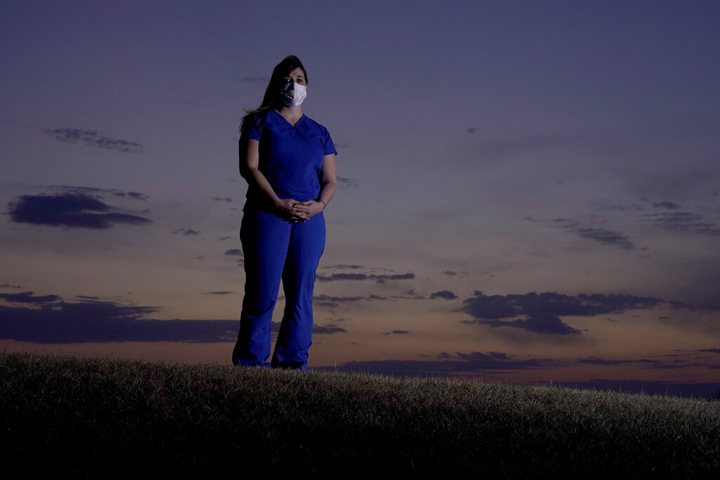 Emergency room nurse L'Erin Ogle stands at dawn before starting her 12-hour shift at a nearby hospital Tuesday, March 9, 2021, in Overland Park, Kan. After a year of working long hours taking care of COVID-19 patients, Ogle feels obligated to speak out when she sees misinformation related to the pandemic in her community. (AP Photo/Charlie Riedel)