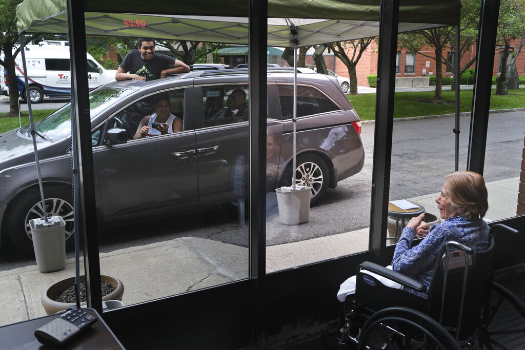 FILE - Gloria DeSoto, 92, right, visits with her family, in their car, from a window of the Hebrew Home at Riverdale, where she lives, in New York, Thursday, June 11, 2020. A focus on the elderly at the start of the nation's vaccination campaign helped protect nursing homes that were ravaged at the height of the U.S. coronavirus outbreak, but they are far from in the clear. New outbreaks, often traced to infected staff members, are still occurring in long-term care centers across the country, causing continued havoc for visitation policies. (AP Photo/Seth Wenig)