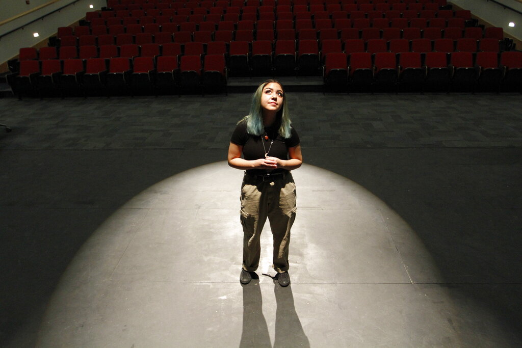 High school senior Helene Trujillo poses for a photo in the theater at Las Cruces High School on Thursday, Feb. 10, 2022, in Las Cruces, N.M. Trujillo said having at least one of her teachers be flexible with deadlines and revisiting lessons has helped her feel less "suffocated." A growing number of schools now are becoming more deliberate about eliminating bias from grading systems as a result of lessons from the pandemic and the nation's broad reckoning with issues of racial injustice following years of advocacy for "equitable grading." (AP Photo/Cedar Attanasio)