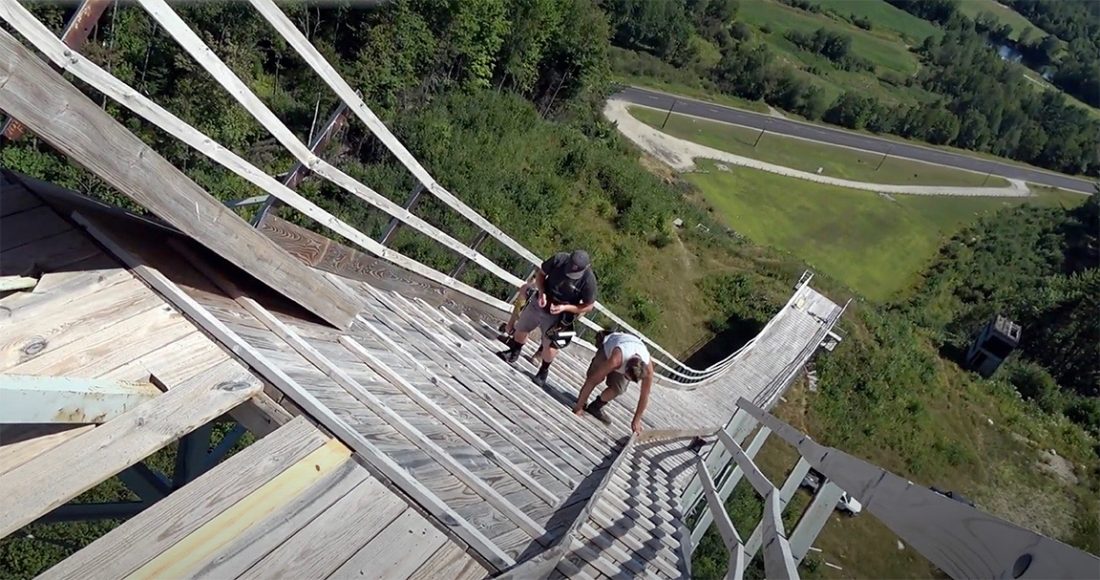 A crew from Knollson Contracting makes repairs to the Big Nansen Ski Jump in Milan. (WeRmudfun video screenshot)