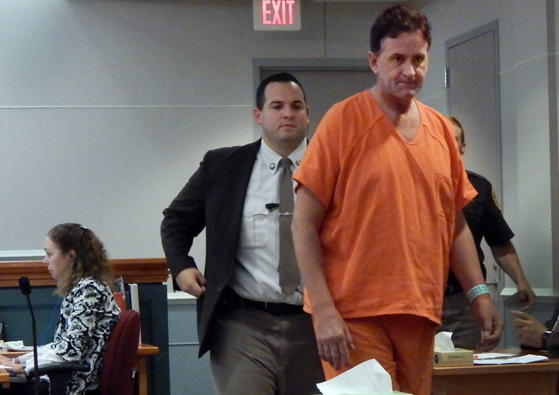 Staff photo by Dean Shalhoup A court officer escorts Thomas Herrmann into the courtroom for his sentencing hearing Thursday afternoon. Herrmann will serve a year in jail after pleading guilty to video recording two young girls in their bedroom and bathroom in 2016.