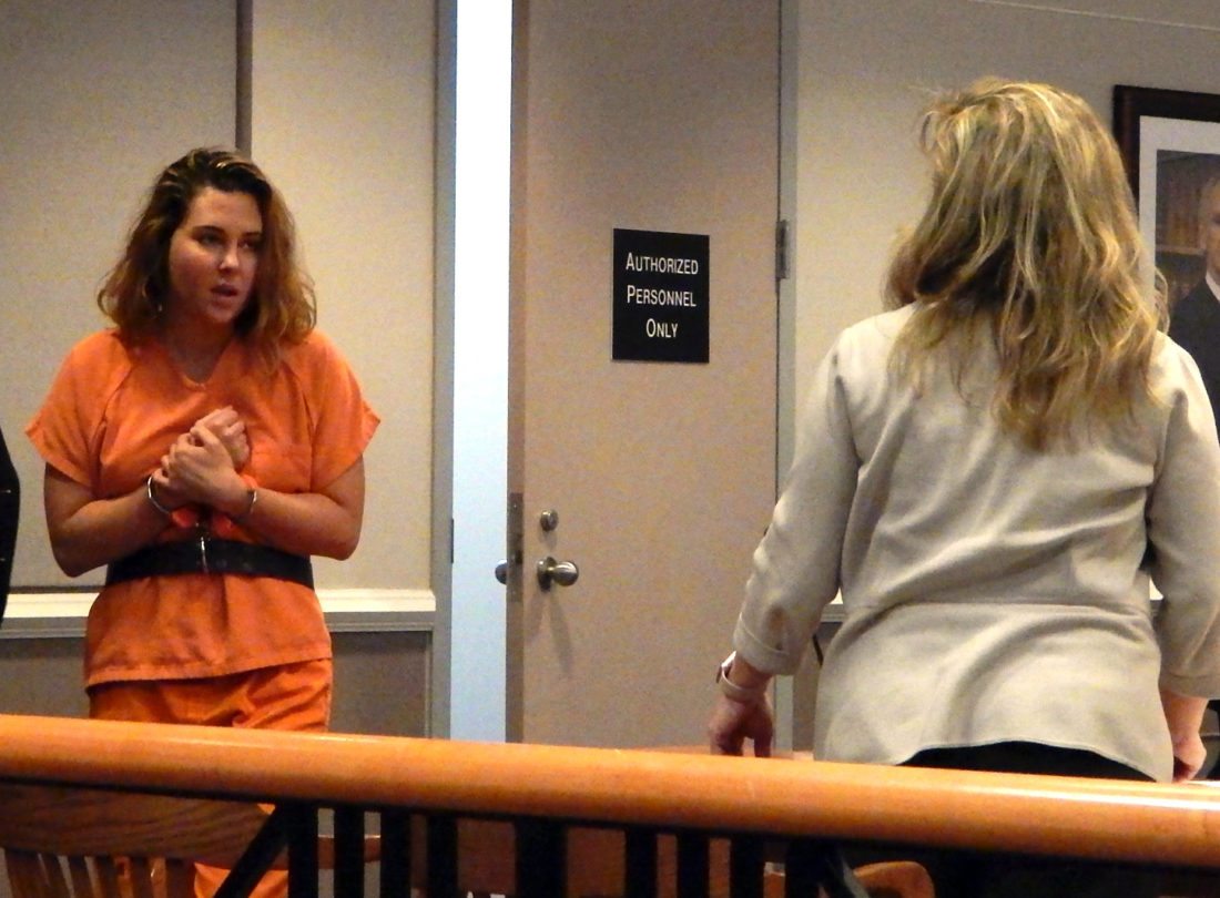 Staff photo by Dean Shalhoup Courtney Ward, Nashua resident charged with first-degree assault for allegedly stabbing a man in Nashua on Sunday, enters court Monday for her arraignment on the felony charge.