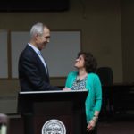 Staff photo by Hannah LaClaire Nashua mayor Jim Donchess thanks Dominique Boutaud, who has been coordinating Francophonie events in the city for several years.