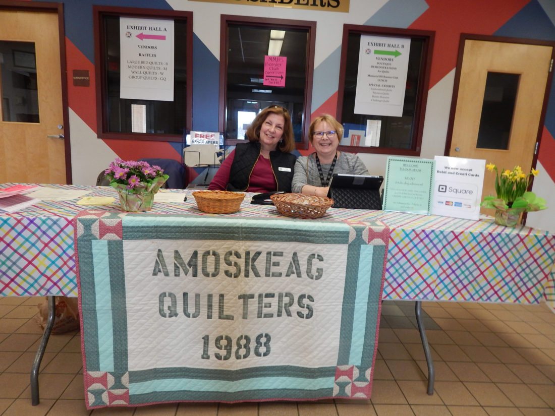 Photo by LORETTA JACKSON Volunteers Patti Bookless, left, of Hampstead, and fellow guild member Faye Tresvik, of Amherst, prepare to greet visitors to the Amoskeag Quilters Guild biennial quilt show, an event held at Manchester Memorial High School a venue that accommodated over the course of a weekend hundreds of quilting enthusiasts.