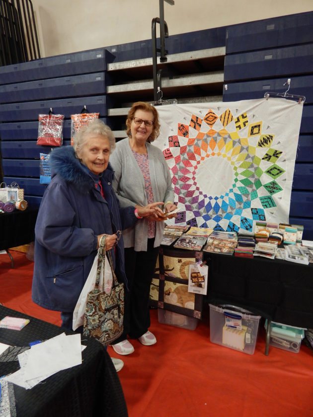 Photo by LORETTA JACKSON Bette Belanger, background, of Amherst, the owner of Quilting a Way to a Pieceful Life, an Amherst business that was represented along with many other vendors at the 15th biennial show recently hosted by the Amoskeag Quilters Guild, wraps a newly purchased craft kit for patron Kathryn Fleming, a longtime quilter from Merrimack.