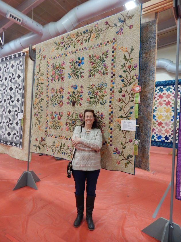 Photo by LORETTA JACKSON Merrimacks Terry Burris, owner of Terry Burris Quilting Services, displays one of her show entries, Spring Bouquet, a quilted work of art that took awards at the Amoskeag Quilters Guild show, an event that drew 170 entries and included demonstrations, vendors and raffle prizes, including a grand prize of an intricately worked quilt rendered collaboratively by numerous guild members and completed with longarm quilting by Terry Burris Quilting Services on behalf of beneficiary St. Joseph Community Services.