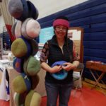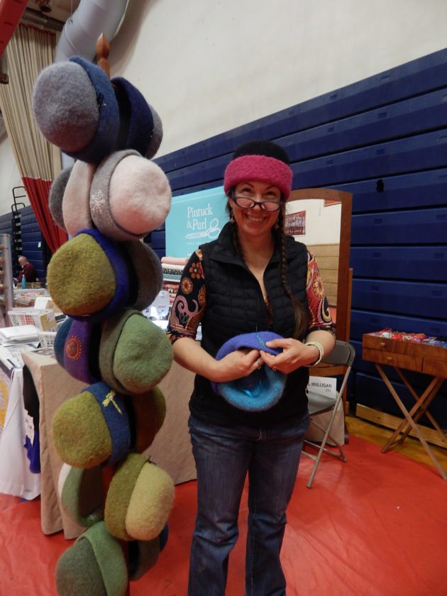 Photo by LORETTA JACKSON Carrie Cahill Mulligan, a vendor at the Amoskeag Quilters Guild quilt show, displays some of her heirloom-quality handknit hats, felted creations that are lavishly embroidered and knitted from 50 percent llama wool, a fiber reputed to be eight times warmer than the wool from sheep.