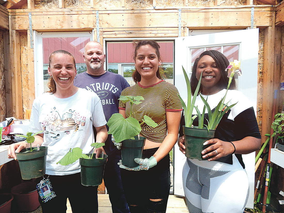 Photo by LORETTA JACKSON A display of some of the plants grown from seed at the newly built greenhouse at Nashua High School South that was constructed by students and faculty of three trade programs within the Nashua Technology Center there include volunteer gardeners, from left, Heather Dubois, initiator of the greenhouse project and the instructor of the school’s Family & Consumer Sciences program; Alan Verley, the teacher of the NTC’s Construction Technology program, one of three trade programs whose members assisted in the greenhouse project; Fernanda Dela Lima, a junior and student of the FACS program; and Gemma Djossou, a sophomore whose participation in the FACS program evolved into a successful gardening project.