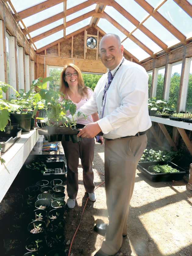 Photo by LORETTA JACKSON Nashua High School South Principal Keith Richard and Cathy Lui, the school’s special education department secretary, select for purchase some plants nurtured from seed at the school’s newly built greenhouse, a project initiated by Heather Dubois, the school’s Family & Consumer Sciences teacher, who credited its completion to a joint effort by students and faculty of three programs that are a part of the school’s 15-program Nashua Technology Center.