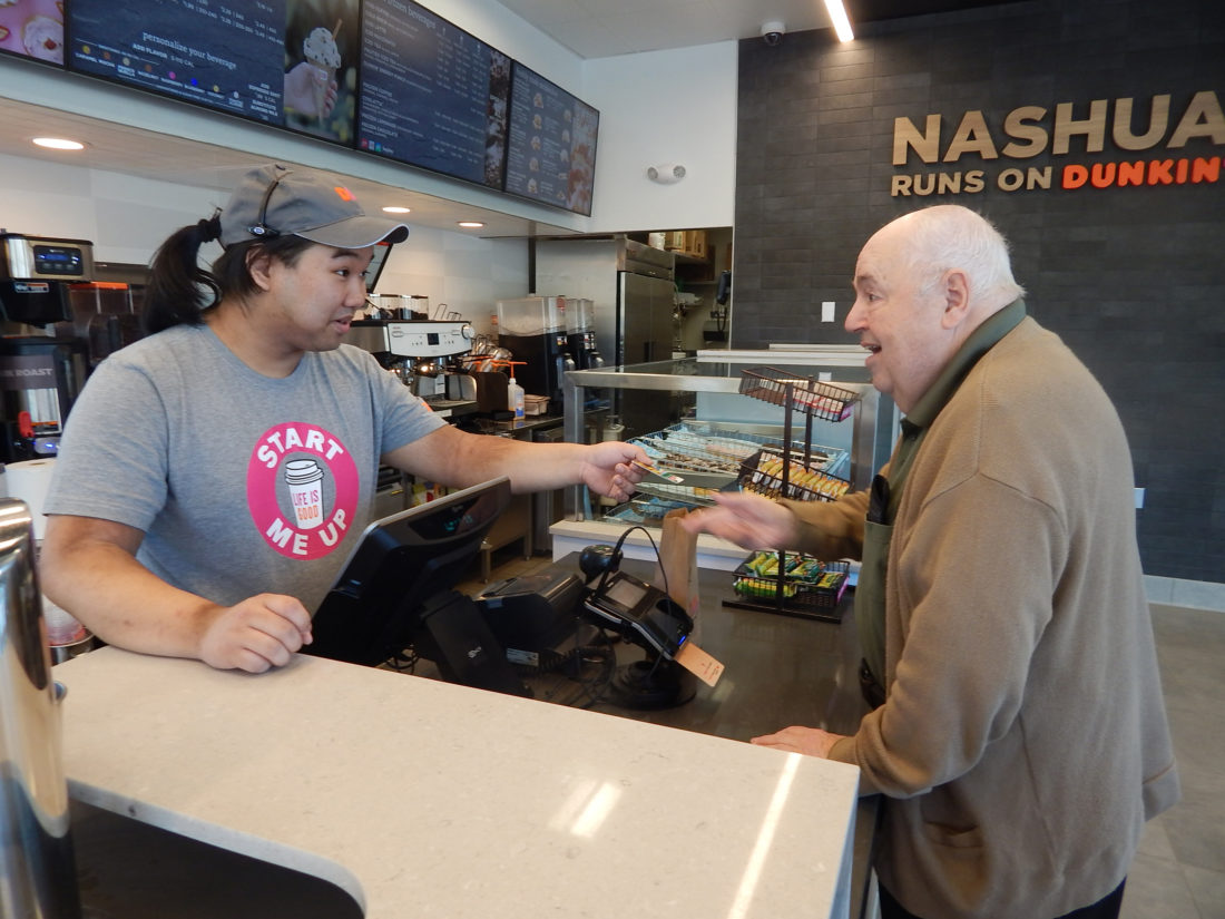 - Photo by LORETTA JACKSON Dunkin’ crew member Bryan Li completes the purchase of a coffee and donut by Nashua’s Dan Jordan, an Army veteran and longtime patron of the newly rebranded and renovated restaurant on Amherst Street, who with his wife “Peg” visits there nearly daily, a practice he said has deemed them “almost seven-day-a-week customers” of the former Dunkin’ Donuts shop and, now, of the newly named Dunkin’ restaurant.