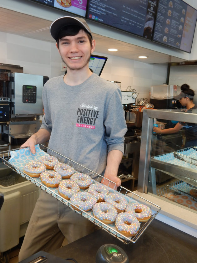 Dunkin’ Manager Bryce Scanlon, of Nashua, saluted the shop’s legion of dedicated patrons for the non-stop flow of traffic, coffee and tasty eats. He said, “We’re here for them – we’re fueled by positive energy – life is good.”