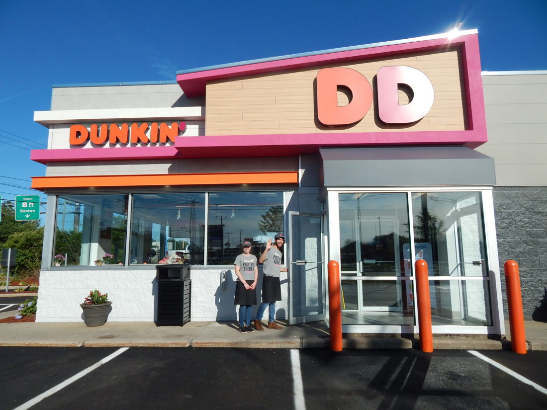 Photo by LORETTA JACKSON Dunkin’ crew members Lydia Mathson and Miguel Rodriguez, both of Nashua, welcome customers to the newly redesigned and renovated Dunkin’ restaurant on Amherst Street in Nashua that now sports bright, new, pink-and-orange signage indicating that the franchised restaurant, owned by longtime restaurateur John Motta, of Nashua, now offers high-tech conveniences and serves a multitude of tasty edibles and beverages, along with its signature offering of 18 varieties of donuts.