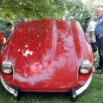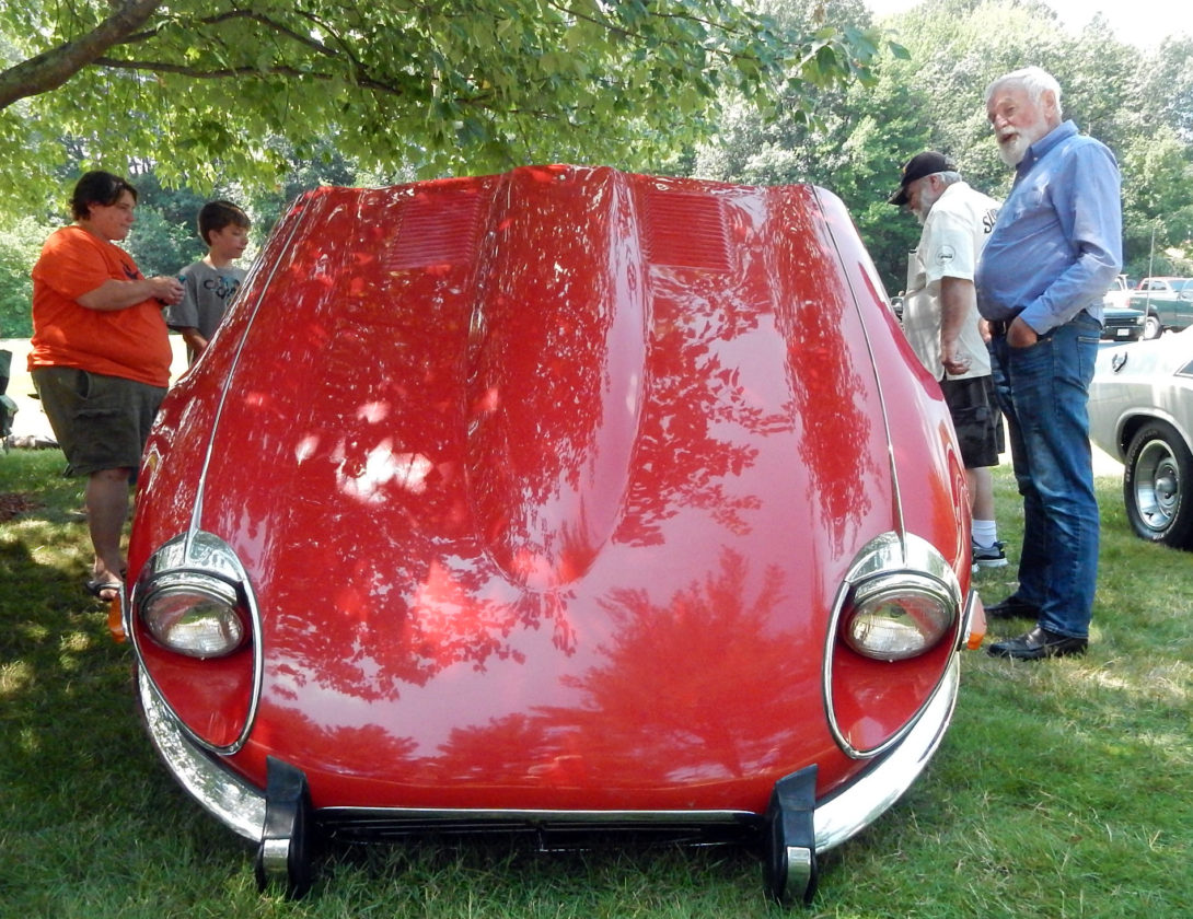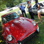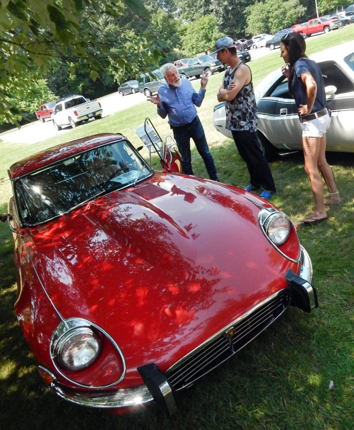 Under the shade of a large oak tree on Sunday, Lawrence, Mass. resident Kevin Barnett chatted with visitors who walked over to get a closer look at his 1973 Jaguar XKE, a V-12 model that attracts attention for both its bright red color and its remarkable condition.