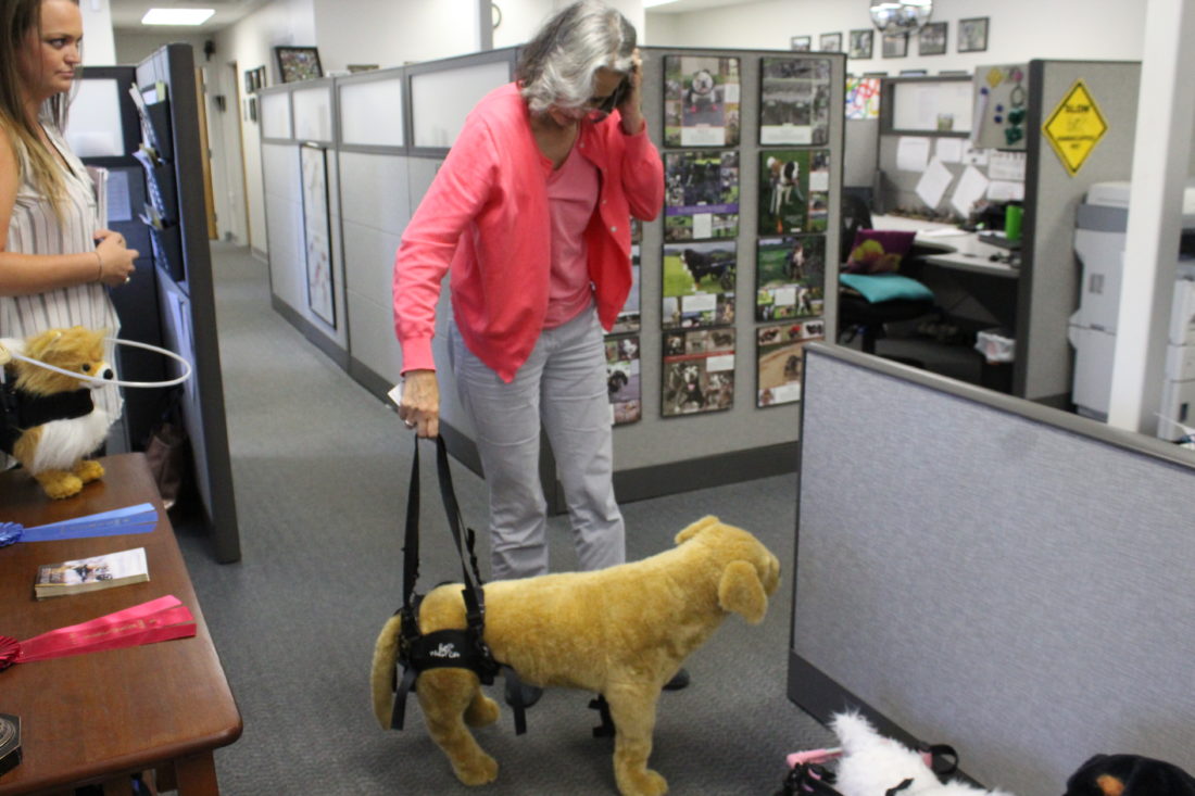 - Staff photo by Hannah LaClaire Lisa Murray demonstrates, using a stuffed Labrador, how the support equipment at Walkin’ Pets works.
