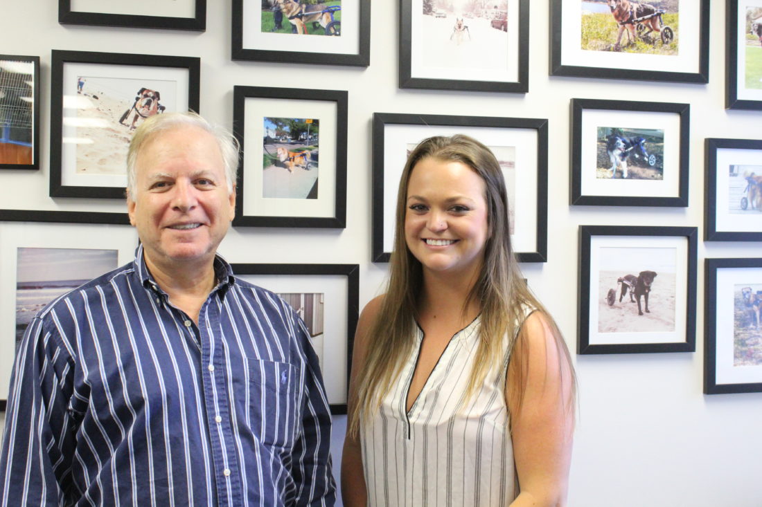 - Staff photo by Hannah LaClaire Mark Robinson and Mikayla Feehan at Walkin’ Pets, an Amherst-based, international company that builds wheelchairs for disabled pets.