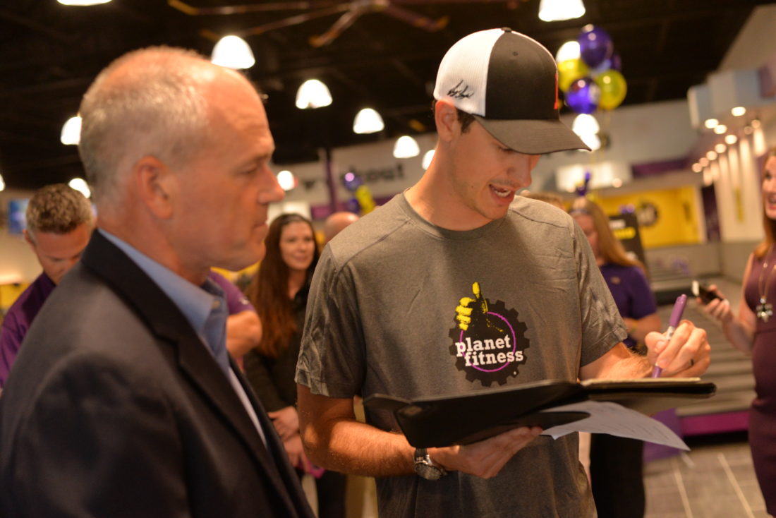 Logano and several other participated in a shorter version of the PF Teen Summer challenge workout, which encourages teens 15 to 18 years old to sign up and workout for free at any Planet Fitness gym location in New Hampshire through Sept. 1. Rather than go for the full 30-minute workout, they were guided through a few exercises, including planking and high knees. Following that brief adrenaline-boosting warm-up, Logano made his way back toward the front of the gym to sign a locker for the gym, locker number 22, which is his cars number. He is in New Hampshire for a race at the New Hampshire Motor Speedway, and said it’s definitely a great initiative to get teens into a gym and doing things over the summer.