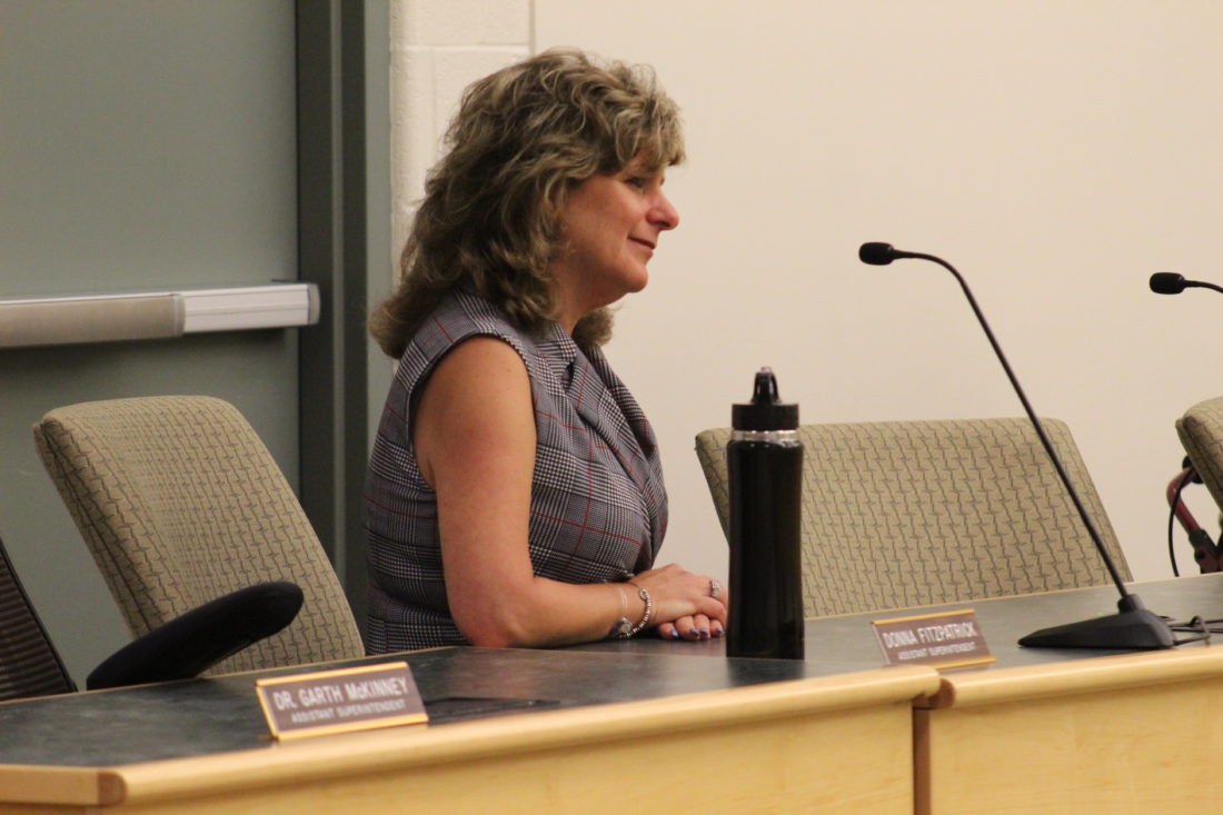 Staff photo by Hannah LaClaire Helayne Talbott listens to proceedings during the Monday Nashua Board of Education meeting. Officials hired her to serve as principal of New Searles Elementary School.