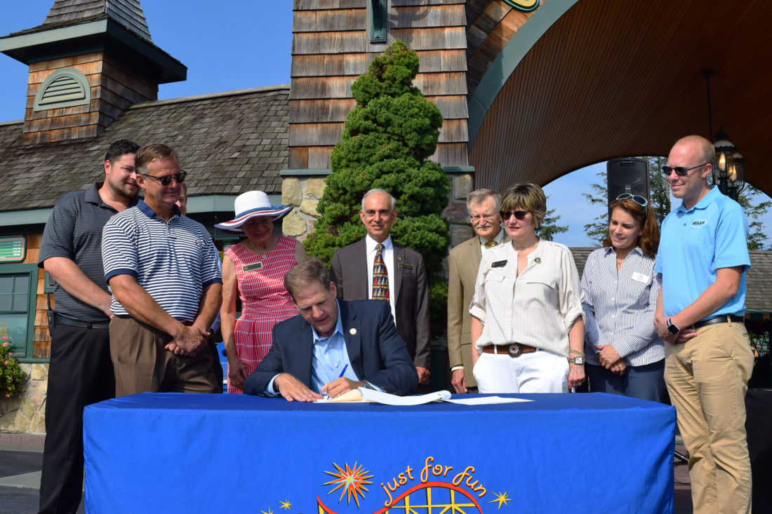 Courtesy photo Gov. Chris Sununu signs an executive order at Canobie Lake Park in Salem on Tuesday creating a study commission to examine the possibility of delaying the start of the school year until after Labor Day.