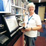 Photo by LORETTA JACKSON Merrimack's Sheila Lippman, circulation aide at the Merrimack Public Library, arranges some materials in advance of Sunday’s 125th birthday party nearby one of the most popular of library conveniences, a self-checkout station that enables a library patron to borrow items by scanning the book's barcode and the barcode on the borrower's library card.