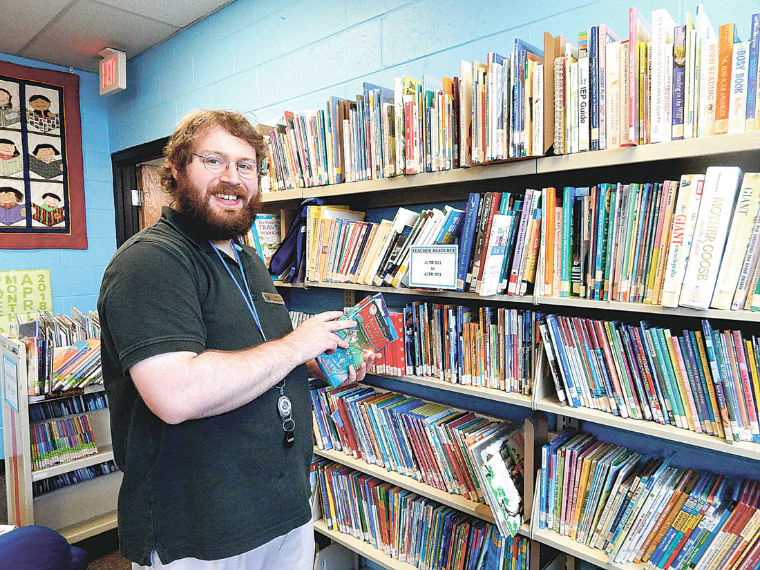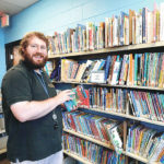 Photo by LORETTA JACKSON Benjamin Stinson, a resident of Concord who each week for four days mans the Children’s Room on the lower level of the Merrimack Public Library, arranges some books about dogs and other popular pets that surely will draw interest from youngsters attending the library’s 125th birthday festivities on Sunday.