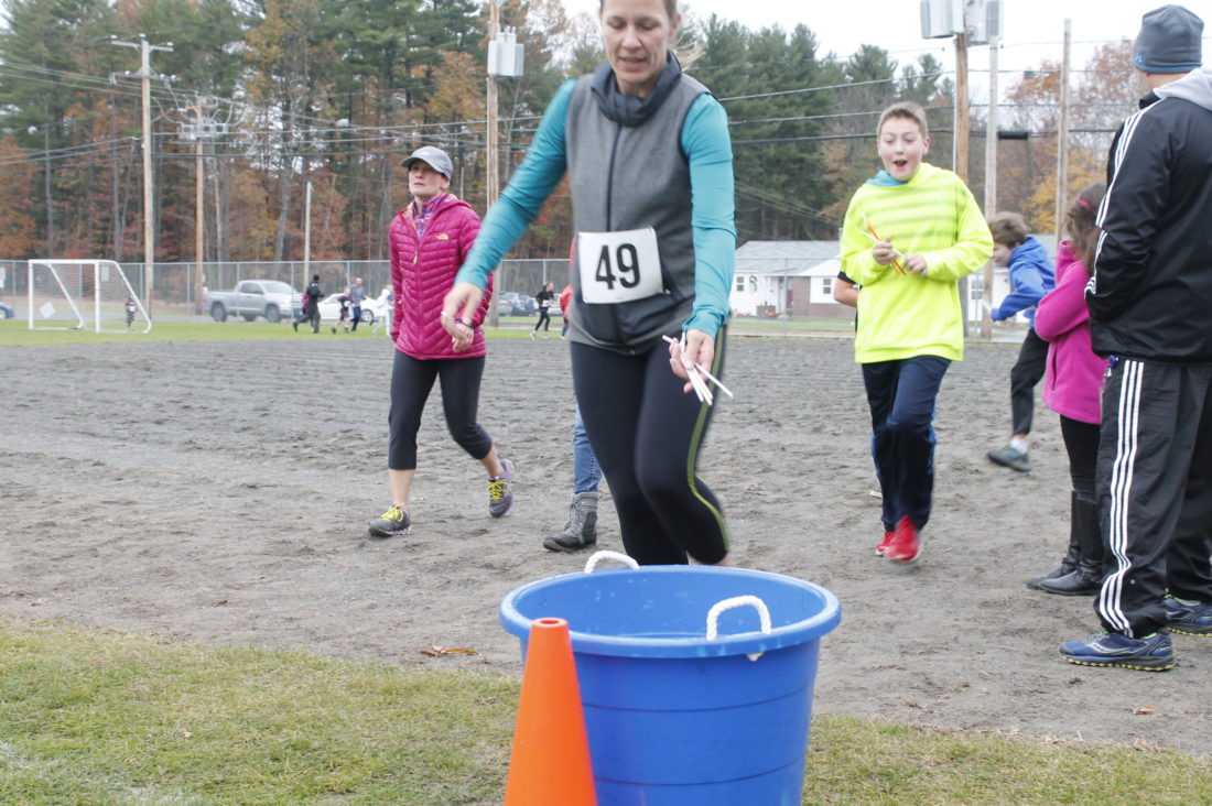 Staff photo by Grace Pecci Those who participated in the Monday Harvest 3k Walk/Run ran six laps around the field. Participants dropped straws into a bucket to signify their current lap.