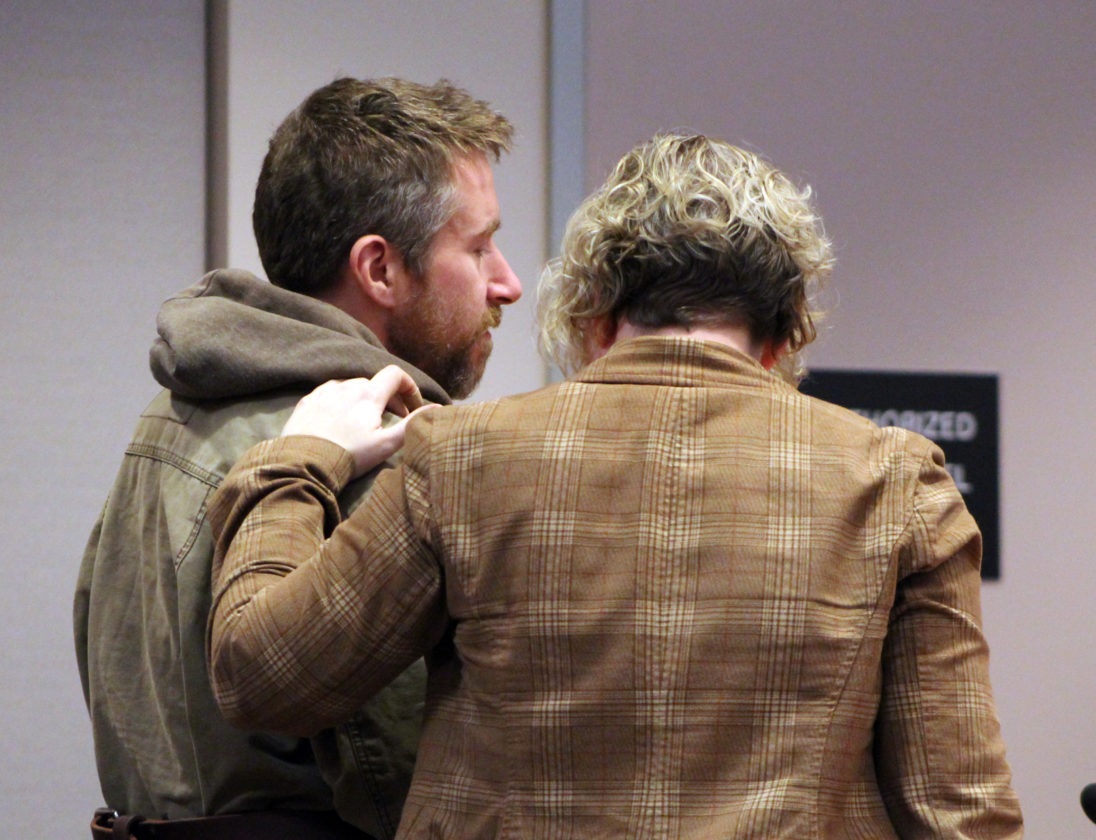 Staff photo by Dean Shalhoup Kevin Olena listens to his lawyer, Attorney Sarah Amorin, during his arraignment Monday on several charges stemming from allegations he violated court orders and burglarized a woman's house. He was ordered held on preventive detention.