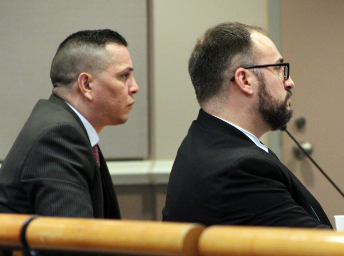Staff photo by Dean Shalhoup William Luna, left, listens to testimony Monday with one of his attorneys, Anthony Naro, on the first day of his trial on charges that accuse him of selling fentanyl to a Pelham man who later overdosed and died.
