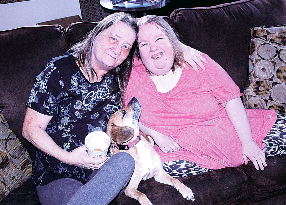 Staff photo by Dean Shalhoup Diagnosed with terminal brain cancer and expected to die shortly before Chistmas some 25 years ago, Sara Martin and her mom, Susan, left, had other ideas, and although the disease caused lifelong disabilities, Sara likes to point out with a smile, "I'm still here!" They are joined by one of their pets, Jackie.