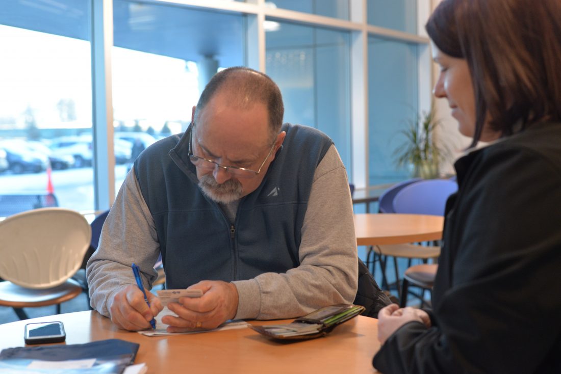 Telegraph photo by ADAM URQUHART U.S. Navy veteran Barry Jordan served from 1970-72. He stopped by the YMCA of Greater Nashua Saturday for VA Information Day. Here, he completes some forms while Women Veterans Program Manager Laura Caisse talks him through the process.