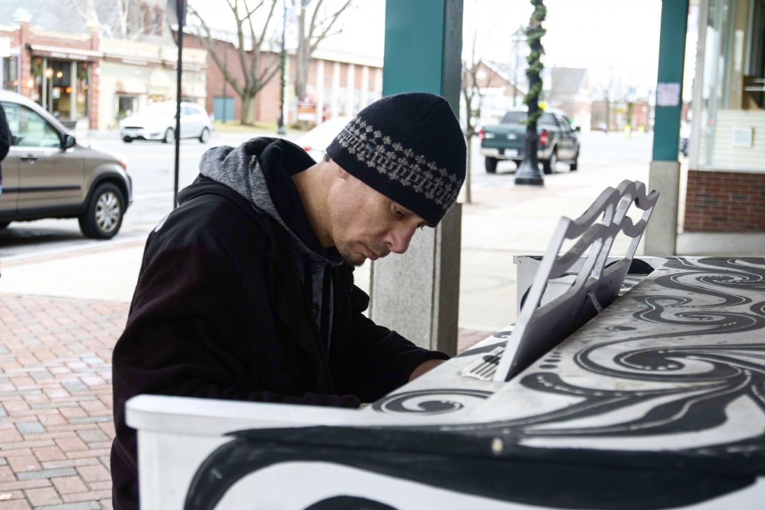 File photo Mark Arabia, a new resident to Nashua, plays one of the Nashua street pianos located in front of the future Performing Arts Center – formerly Alec’s Shoes.