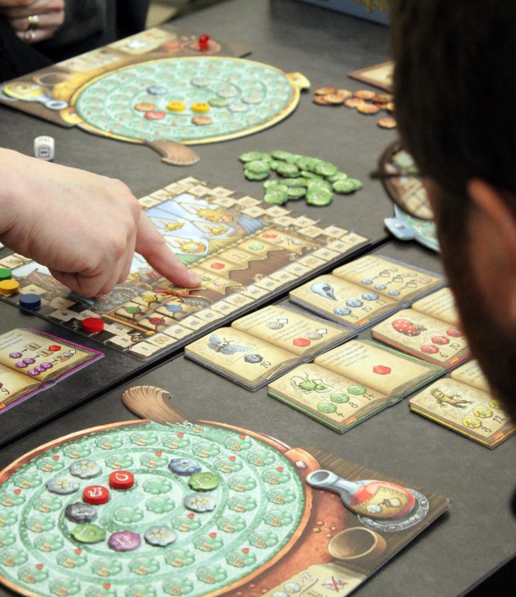- Telegraph photo by DEAN SHALHOUP A participant counts points at the end of a round in an elaborate board game called “The Quacks of Quedlinburg,” that involves cards, tokens, chip-like space markers and dice, during the three-day Granite Game Summit in Nashua.