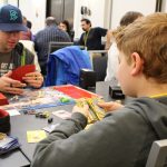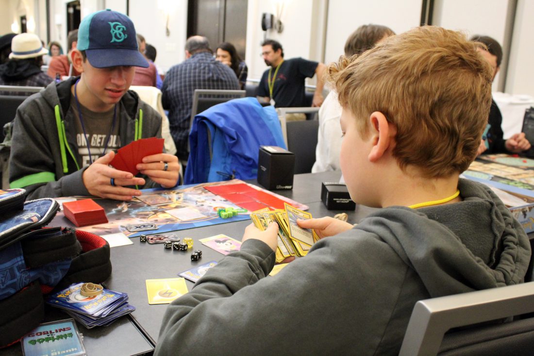 Telegraph photo by DEAN SHALHOUP Youth division gamers and brothers Cory and Rory Zuckerman shuffle cards for the next round of their game on Sunday. They and their parents attended the three-day Granite Game Summit in Nashua.