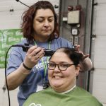 - Telegraph photo by MATHEW PLAMONDON Gina Sennott gets her head shaved by Serenity Salon stylist Christina Ziegler during the St. Baldrick’s Foundation head shaving at the Pepperell Fire Department.