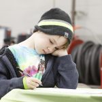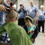 Telegraph photo by MATHEW PLAMONDON Darby Biscornet, 7, of Kingston watched his father Brad, a lieutenant at Kingsboro Fire Department, get his hair buzzed clear off for childhood cancer research at the Pepperell Fire Department in Massachusetts on Wednesday.