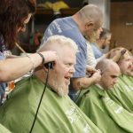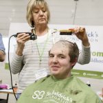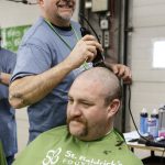 - Telegraph photo by MATHEW PLAMONDON Surrounded by other shavees well on their way to rocking bald heads, Bryan Keith gets his hair buzzed off by Serenity Salon stylist Christina Ziegler during the St. Baldrick’s Foundation head shaving at the Pepperell Fire Department.