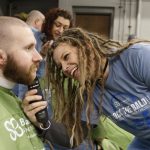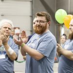 - Telegraph photo by MATHEW PLAMONDON Those waiting in line at the Pepperell Fire Department for their turn to get their heads shave applaud as another shavee’s head is finished being buzzed bald.