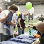 Telegraph photo by MATHEW PLAMONDON Shavees and volunteers pick up their event t-shirt and donate money to the research for childhood cancer.