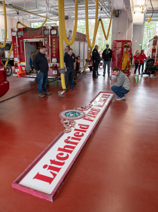 - Photo by JEFFREY HASTINGS Litchfield firefighters and officers who took part in the department’s move to its new station on Liberty Way inspect the sign they removed from the old station, which served the town for 62 years.
