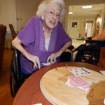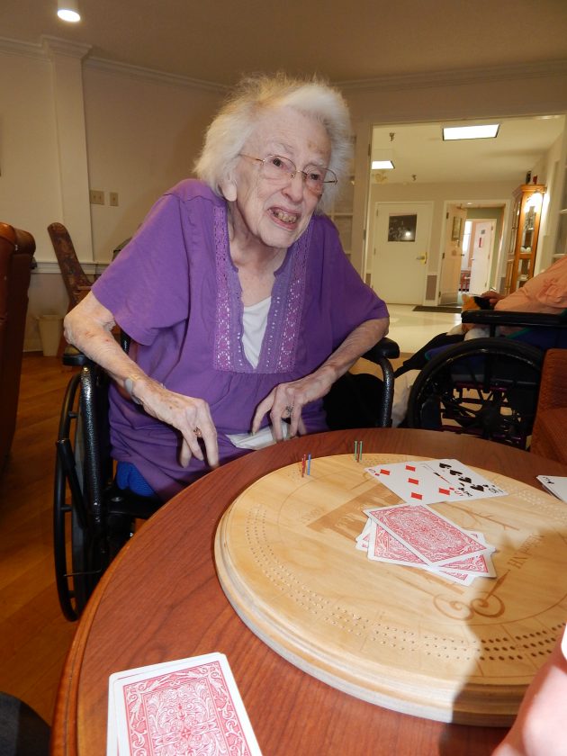 Photo by LORETTA JACKSON Bessie Linsott, a Marine Corp veteran of World War II and a resident of Milfords Crestwood Center, is an expert cribbage player who at nearly 100 years of age is among those now enjoying the cribbage boards designed and produced for the center by engineering students at the Applied Technology Center within Milford High School.
