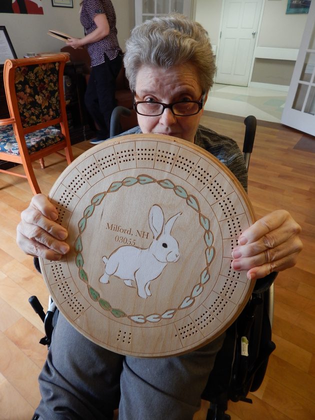 Photo by LORETTA JACKSON Guests and residents at Crestwood Center, a Milford enterprise that is a part of Genesis HealthCare, are well equipped now to play more cribbage, thanks to the generous gift of 18 laser-cut birch cribbage boards designed and rendered by engineering students from Milford Highs Applied Technology Center.