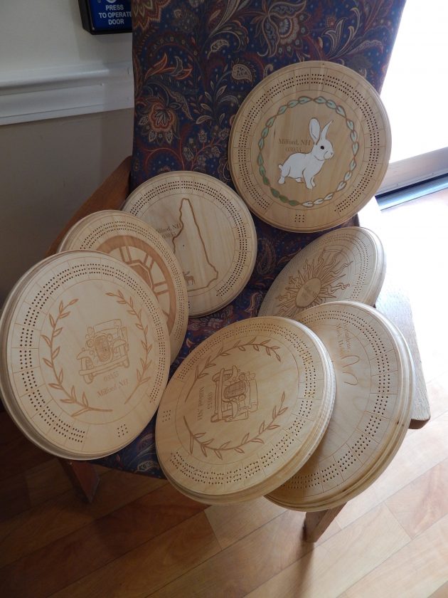 The laser-cut birch plywood cribbage boards bear mostly New Hampshire images. A finely detailed moose and an outline of the map of New Hampshire, along with a Boston Celtics logo, were deemed works of art by more than one player.
